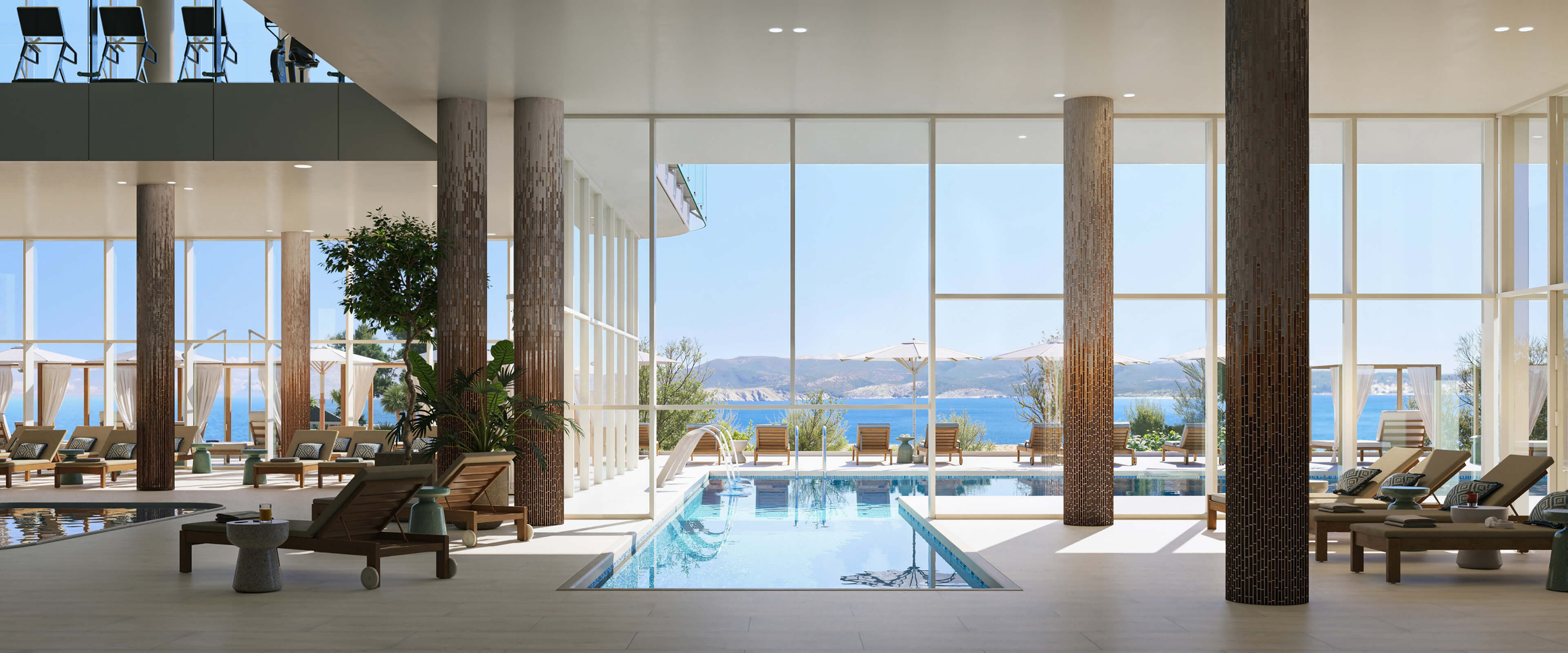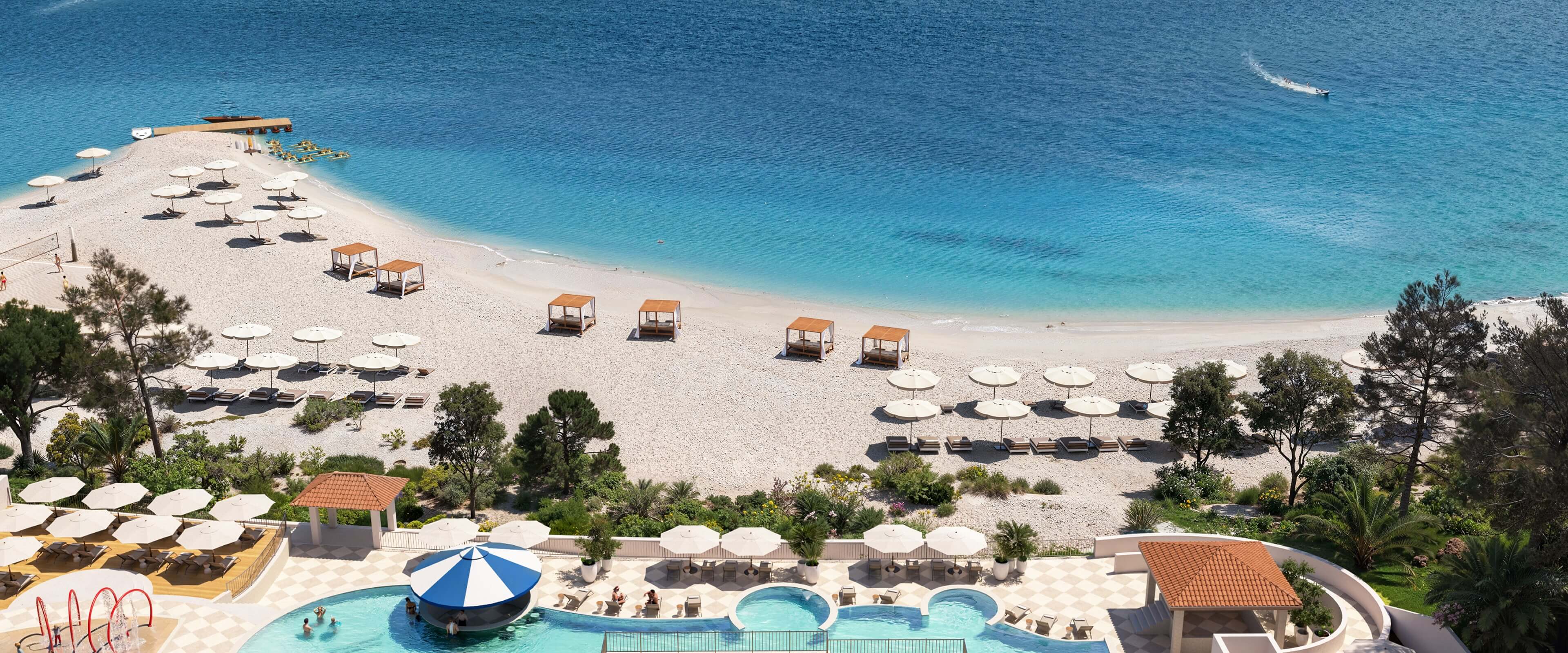 A curated stretch of paved and pebbled beach with stylish loungers, cabanas, and parasols, designed for comfort by the sea. Here, you can choose your rhythm, from peaceful moments of quiet relaxation to active family time with water sports & fun and beach volleyball. The Adriatic unfolds here as your place to relax, recharge, and enjoy.